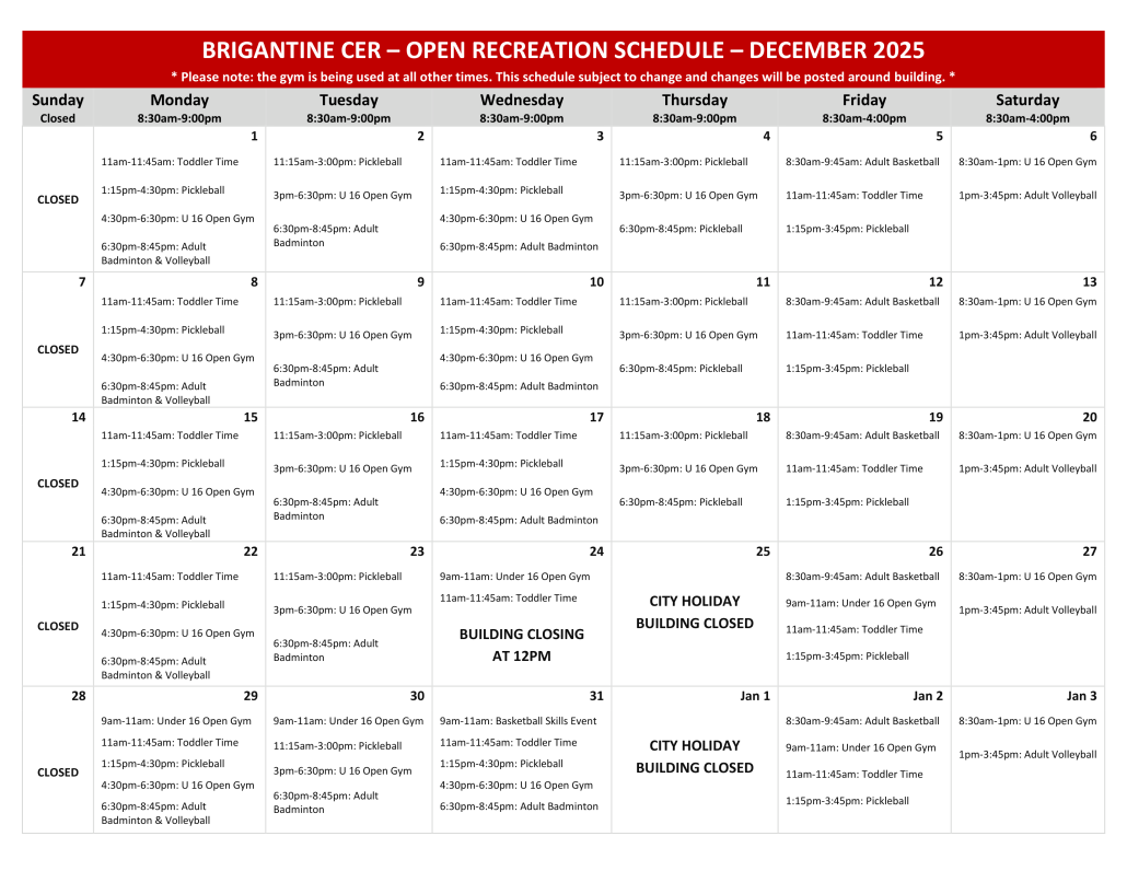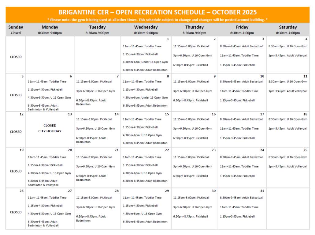 The Brigantine Beach Community Center gym is available for open recreation during the dates and times listed on the monthly calendar below. All facility closures will be updated accordingly, and the gym is being used at all other times. If you have any questions about the gym schedule, please call (609) 264-7350.