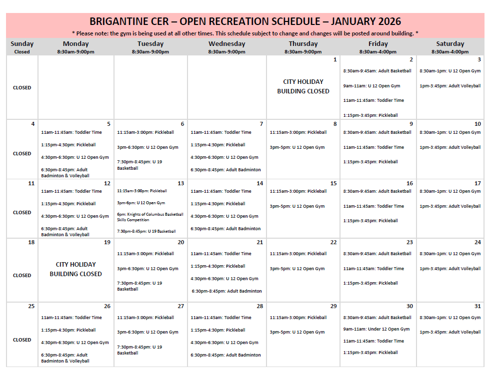The Brigantine Beach Community Center gym is available for open recreation during the dates and times listed on the monthly calendar below. All facility closures will be updated accordingly, and the gym is being used at all other times. If you have any questions about the gym schedule, please call (609) 264-7350.